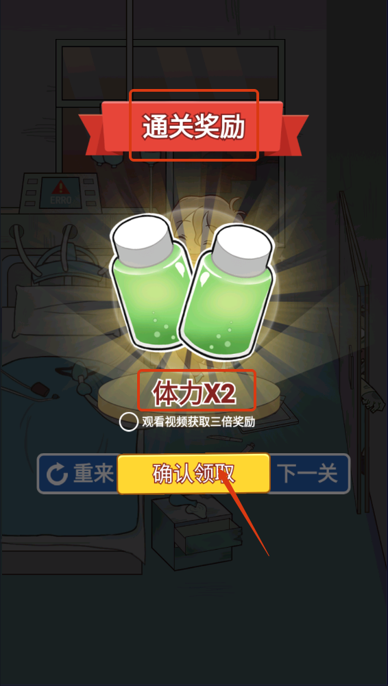 4、通关后领取【体力X2】的通关奖励,点击【确认领取】,积累体力可继续挑战下一关。
