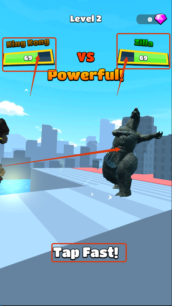 3、对战【King-Kong】与【Zilla】时,【Tap-Fast!】快速点击提升战力,赢得对决。