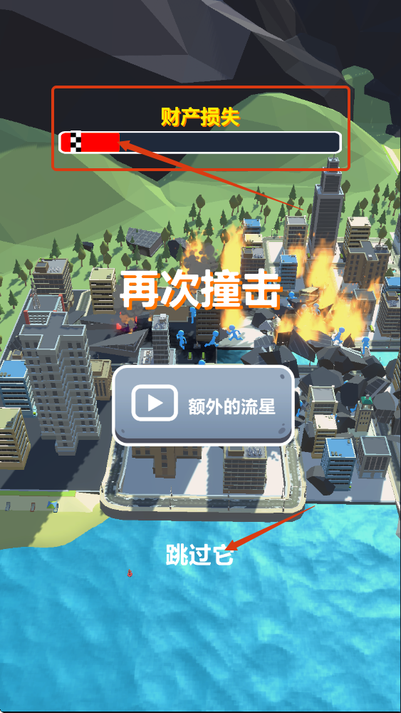 4、撞击结束后,查看【财产损失】进度,可选择【再次撞击】或【跳过它】继续游戏,持续积累资源解锁新流星和场景。
