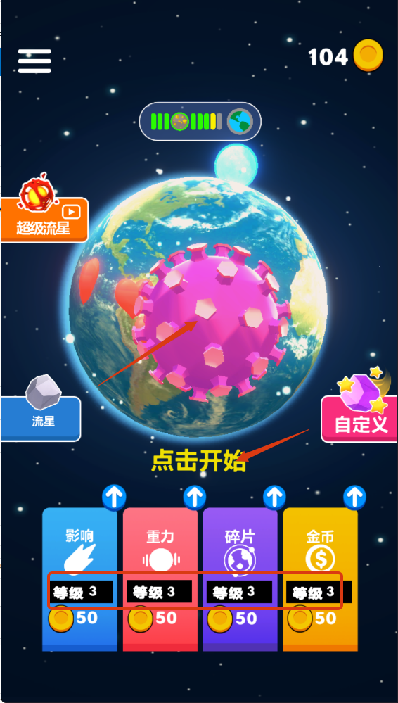 2、当金币达到一定数量时,将【影响】【重力】【碎片】【金币】属性升级至等级3,强化流星撞击效果,当前金币104可规划后续升级。