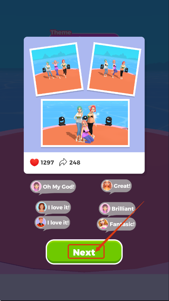 4、完成造型后点击【Next】,查看获【1297-点赞】和【248-分享】的成果,继续挑战下一关。