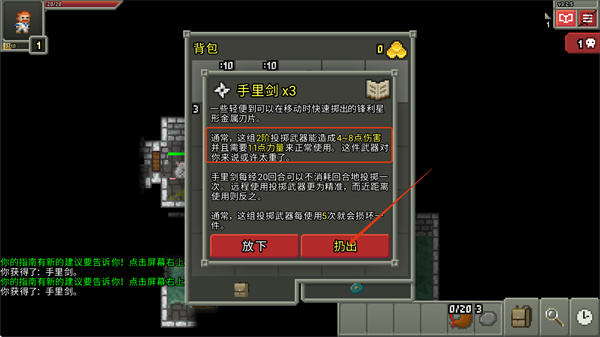 3、打开背包查看【手里剑-x3】,其使用需留意力量消耗,可根据需求选择【放下】或【扔出】,合理管理道具。