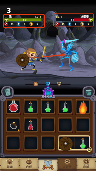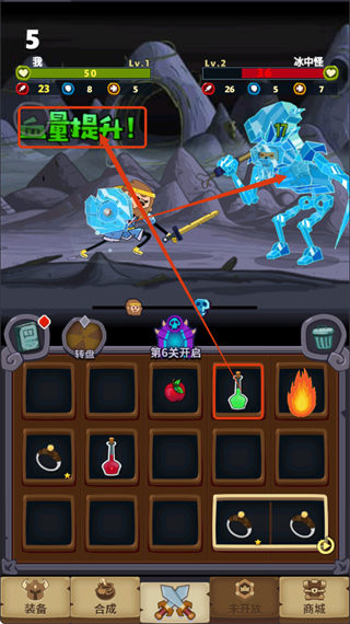 3、战斗中使用【绿色药剂】提升血量,应对【冰中怪-Lv.2】,保障生存的同时持续输出。