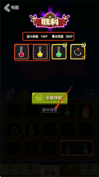4、胜利后领取【战斗经验-14XP】【暴击奖励-28XP】及多种药剂、道具,选择全部领取积累资源。
