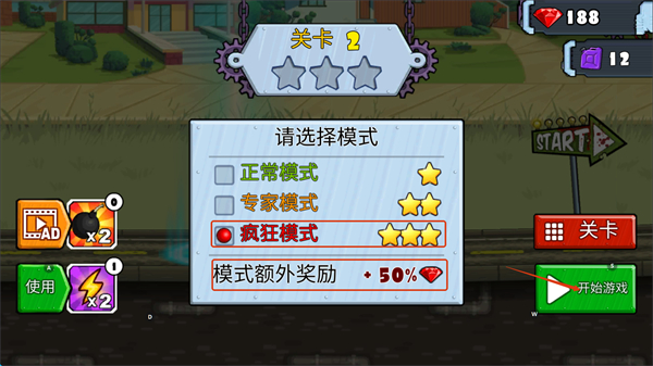 2、选择关卡2【疯狂模式-模式额外奖励-+50%钻石】,点击【开始游戏】,开启高奖励冒险。