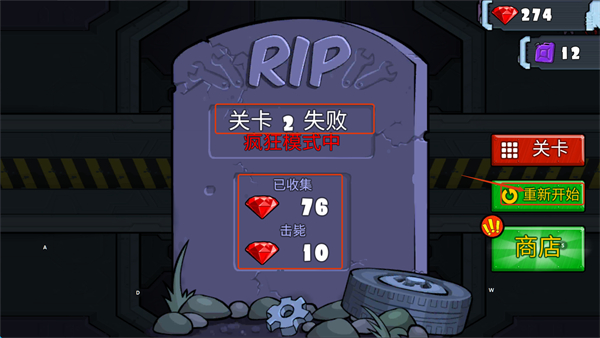 4、关卡2失败后,点击【重新开始】,总结经验再战,争取收集更多钻石与击败敌人。