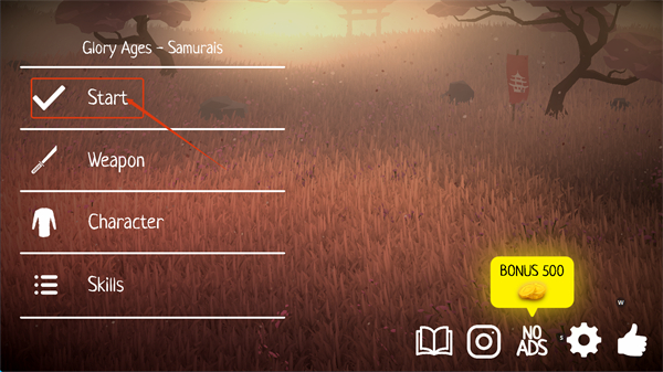 1、进入【Glory-Ages-Samurais】,点击【Start】,领取【BONUS-500】金币,开启武士冒险。