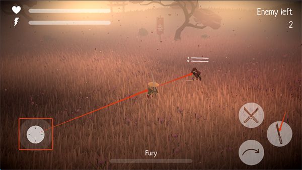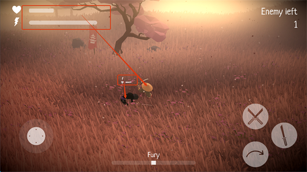 2、战斗时用左侧摇杆移动,右侧点击【刀】攻击,留意【Enemy-left-2】,逐步击败敌人。