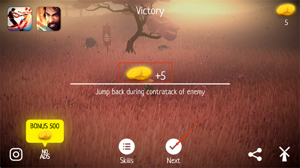 4、胜利后获得【金币-+5】,点击【Next】继续冒险,积累金币提升战力。