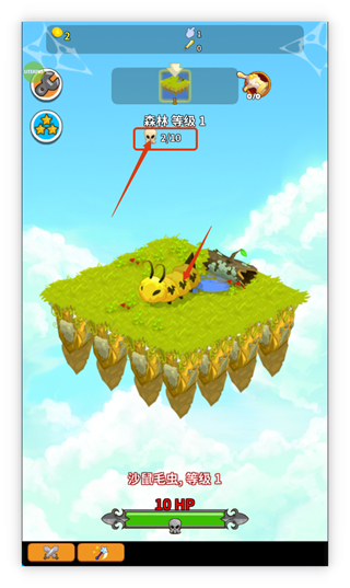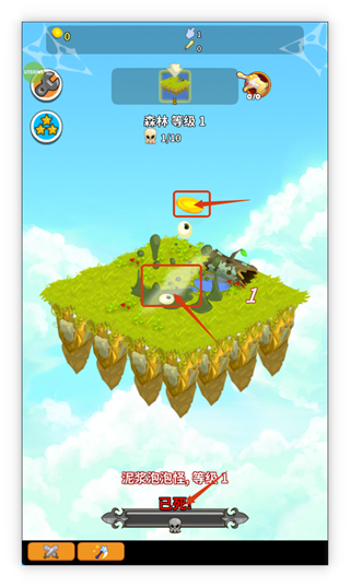 1、遭遇【泥浆泡泡怪-等级1】时,关注其【10-HP】,使用攻击按钮将其击败,推进【森林-等级1】的怪物击杀进度。