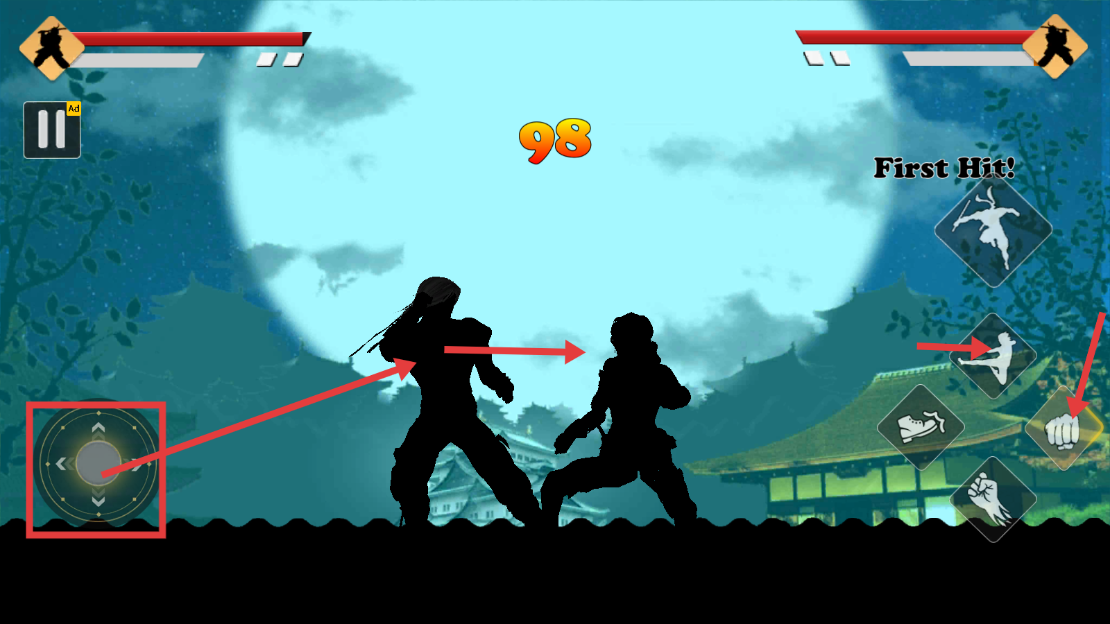 2、战斗中操控左侧移动按钮与右侧技能按钮,打出【98-伤害】并达成【First-Hit!】,掌握战斗操作节奏。
