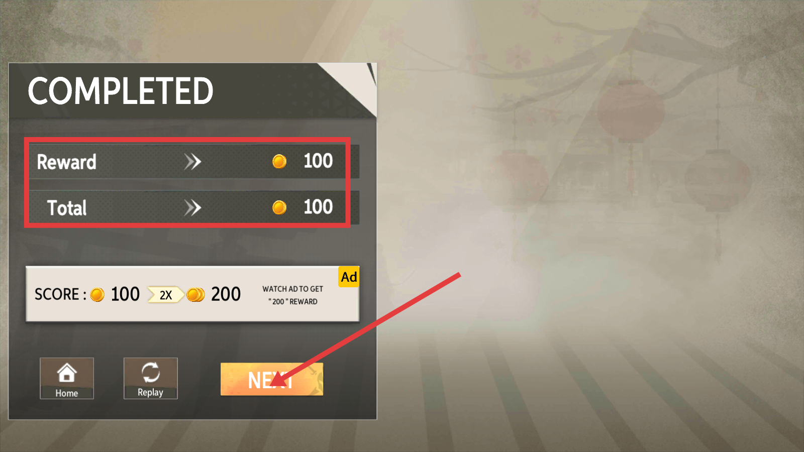 4、战斗胜利后获得【100-金币】奖励,点击【NEXT】按钮,继续推进游戏进程。
