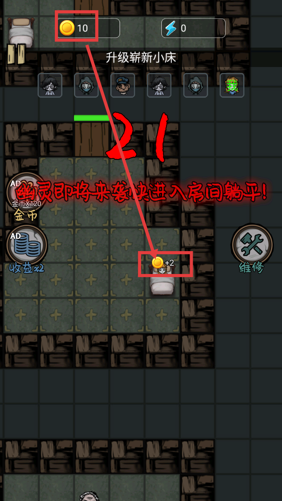 2、幽灵即将来袭时,快速进入房间躺平,通过床铺获取【金币-+2】,积累资源为后续发展做准备。