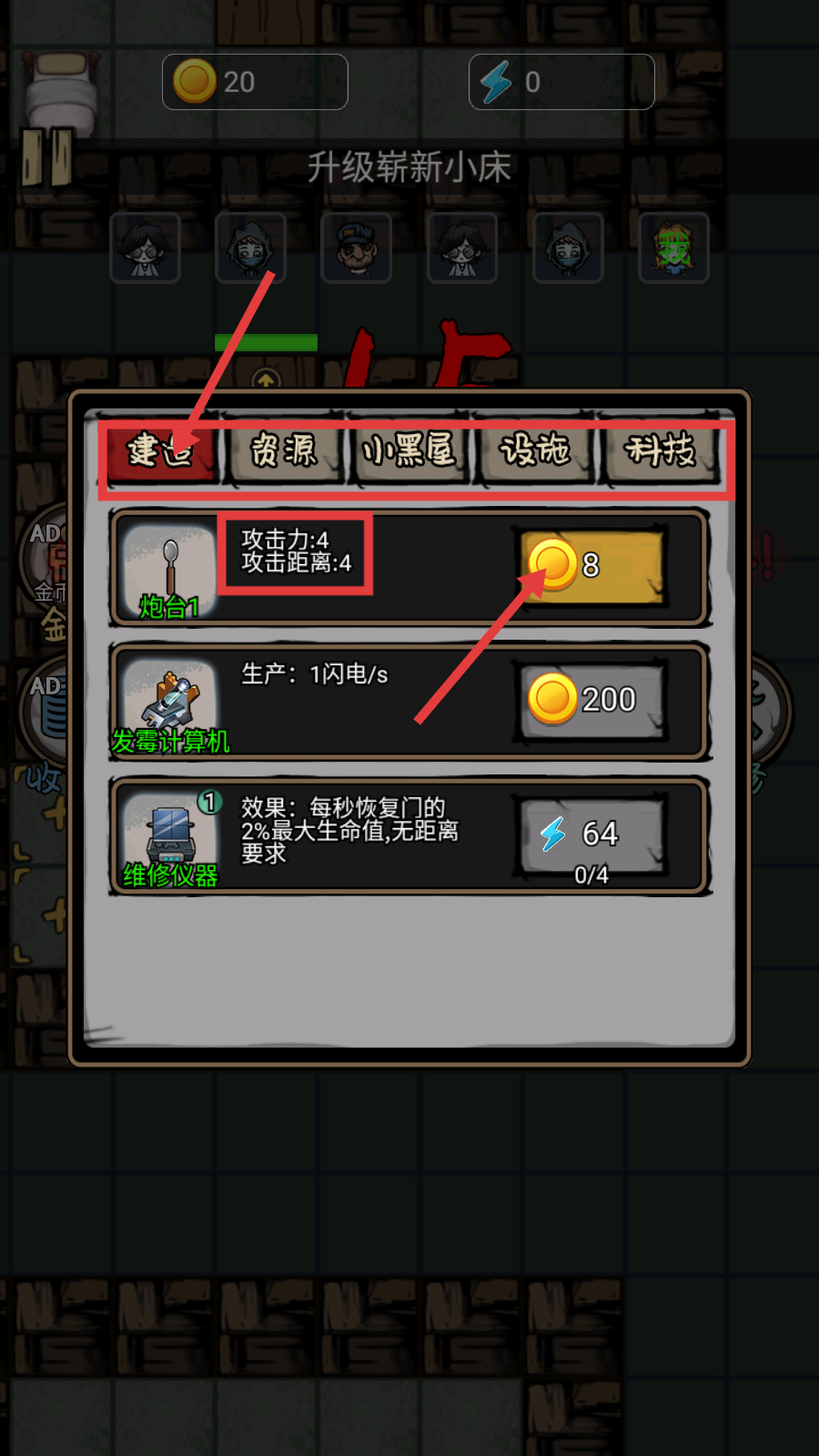 3、进入【建造】界面,花费8金币建造【炮台1】,提升攻击力与攻击距离,增强防御能力。