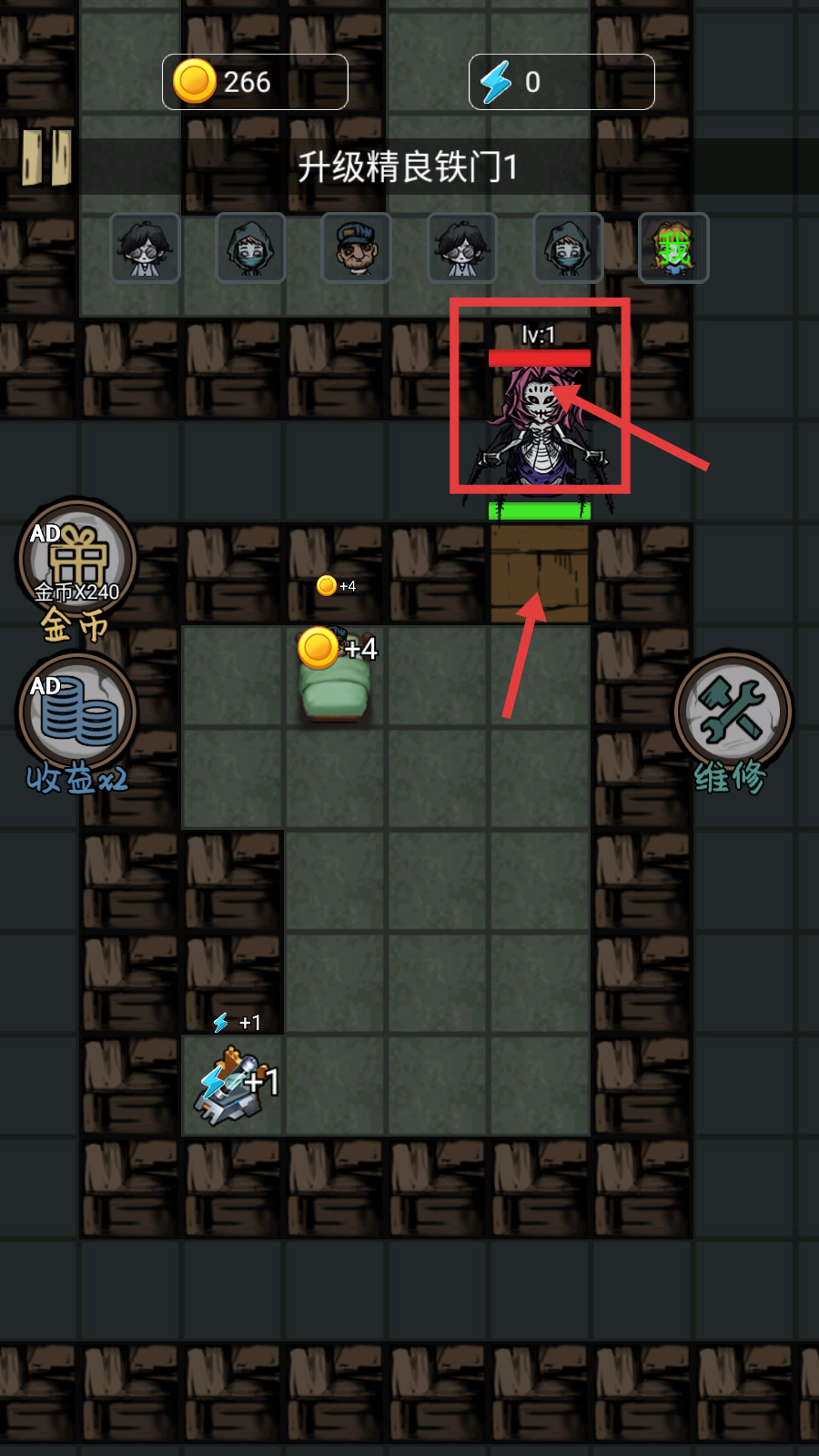 4、升级【精良铁门1】来阻挡lv.1敌人的进攻,同时持续积累金币和闪电资源以强化自身防御体系。