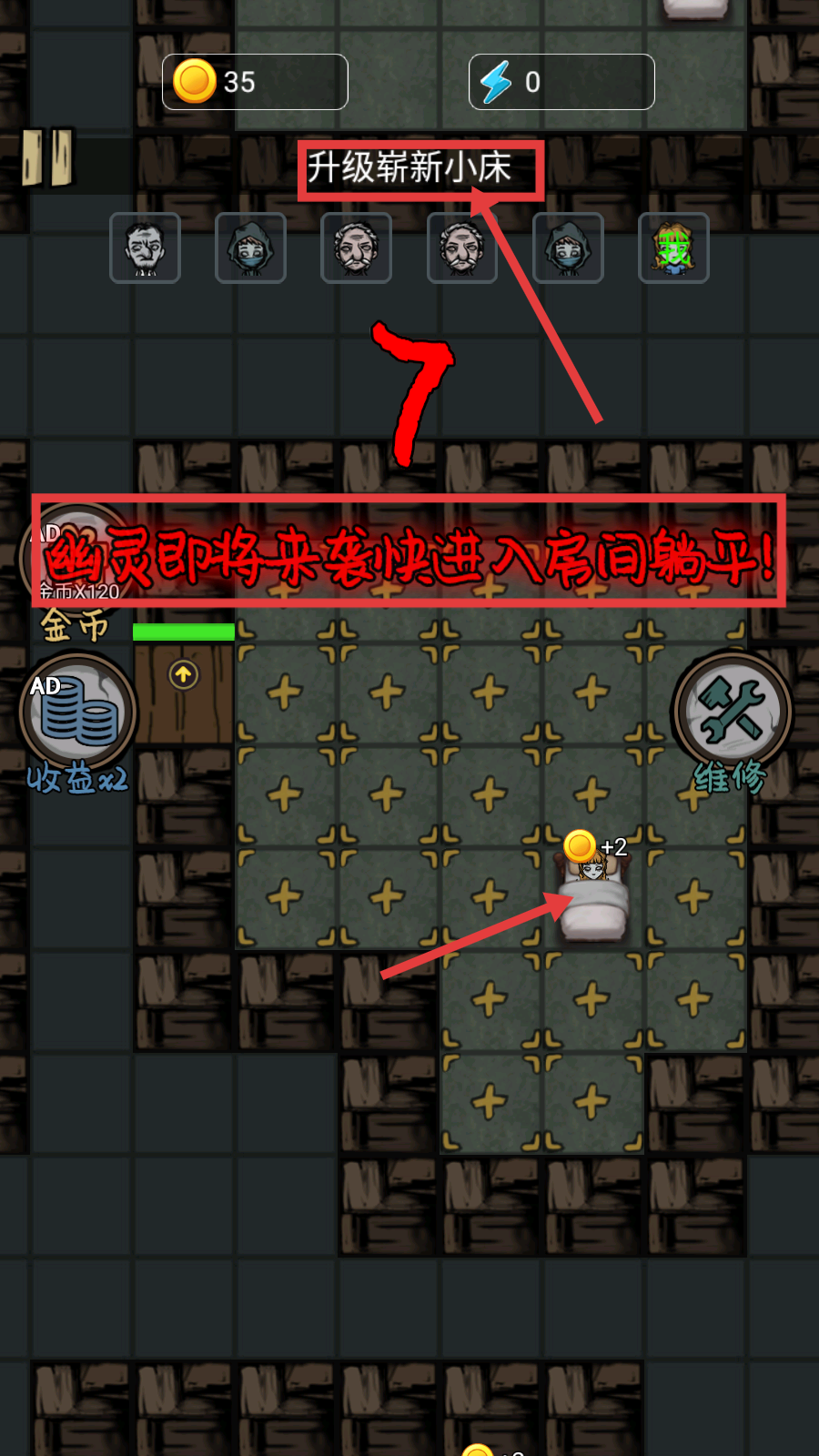 1、幽灵即将来袭时,快速进入房间躺平,及时升级【崭新小床】,通过床铺获取金币资源,为后续发展奠基。