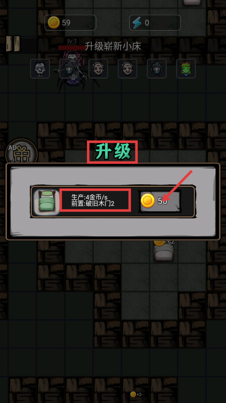2、当满足条件时,花费50金币升级床铺,使其达到【生产-4金币/s】的效率,加快资源积累速度。