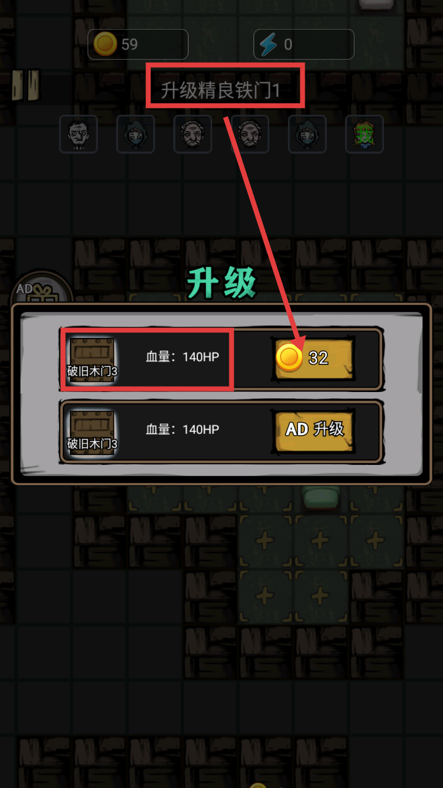 4、花费32金币升级【精良铁门1】,提升门的血量至140HP,增强防御能力以抵御敌人进攻。