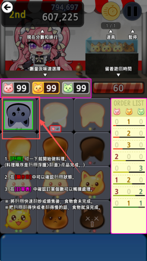 2、接着,根据订单列表的要求,在正确的位置上放置相应的食物。