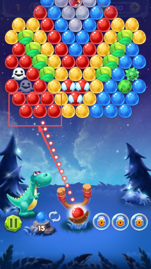 3、然后,松开手指发射泡泡,消除同色泡泡以获得分数。