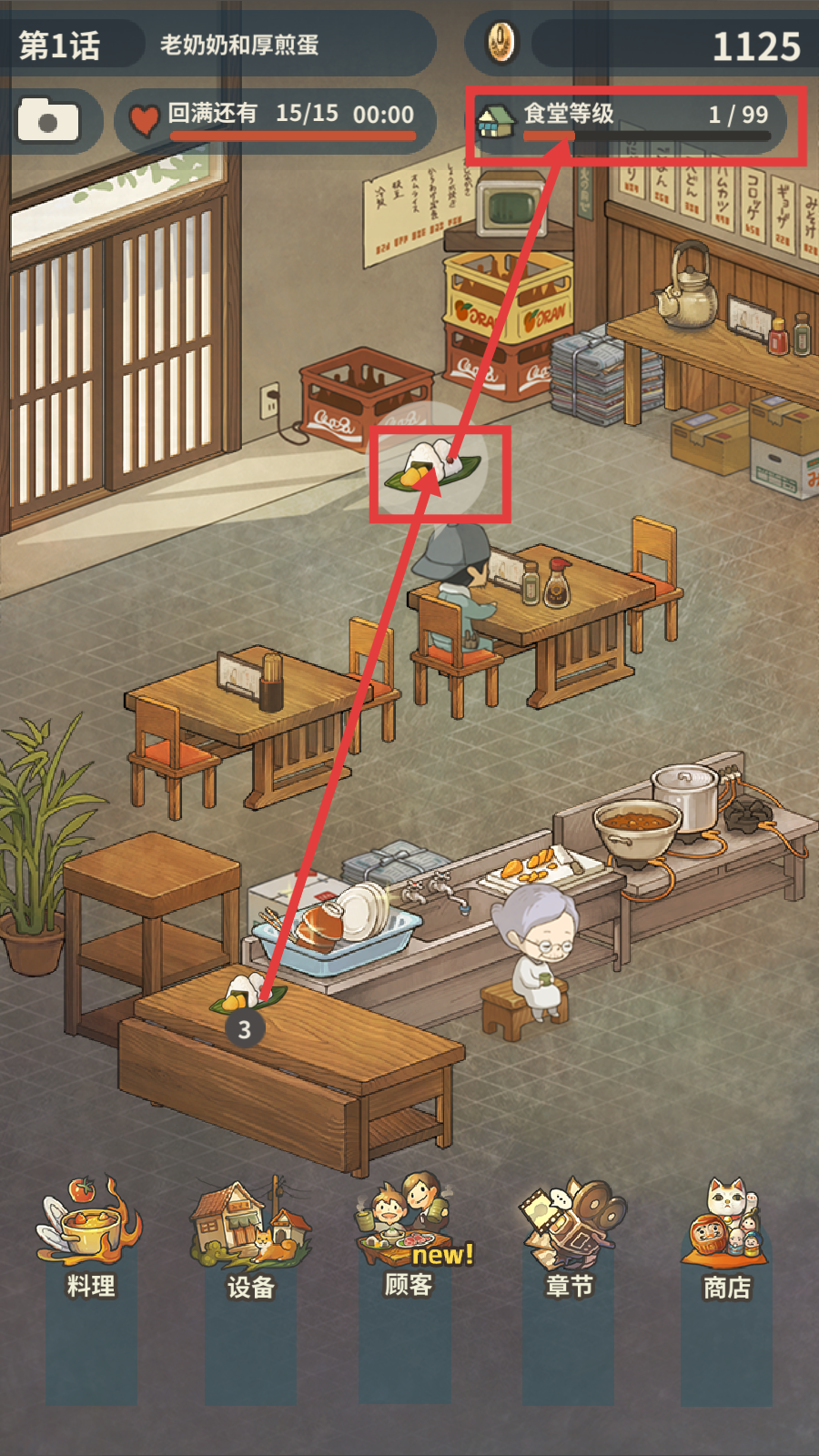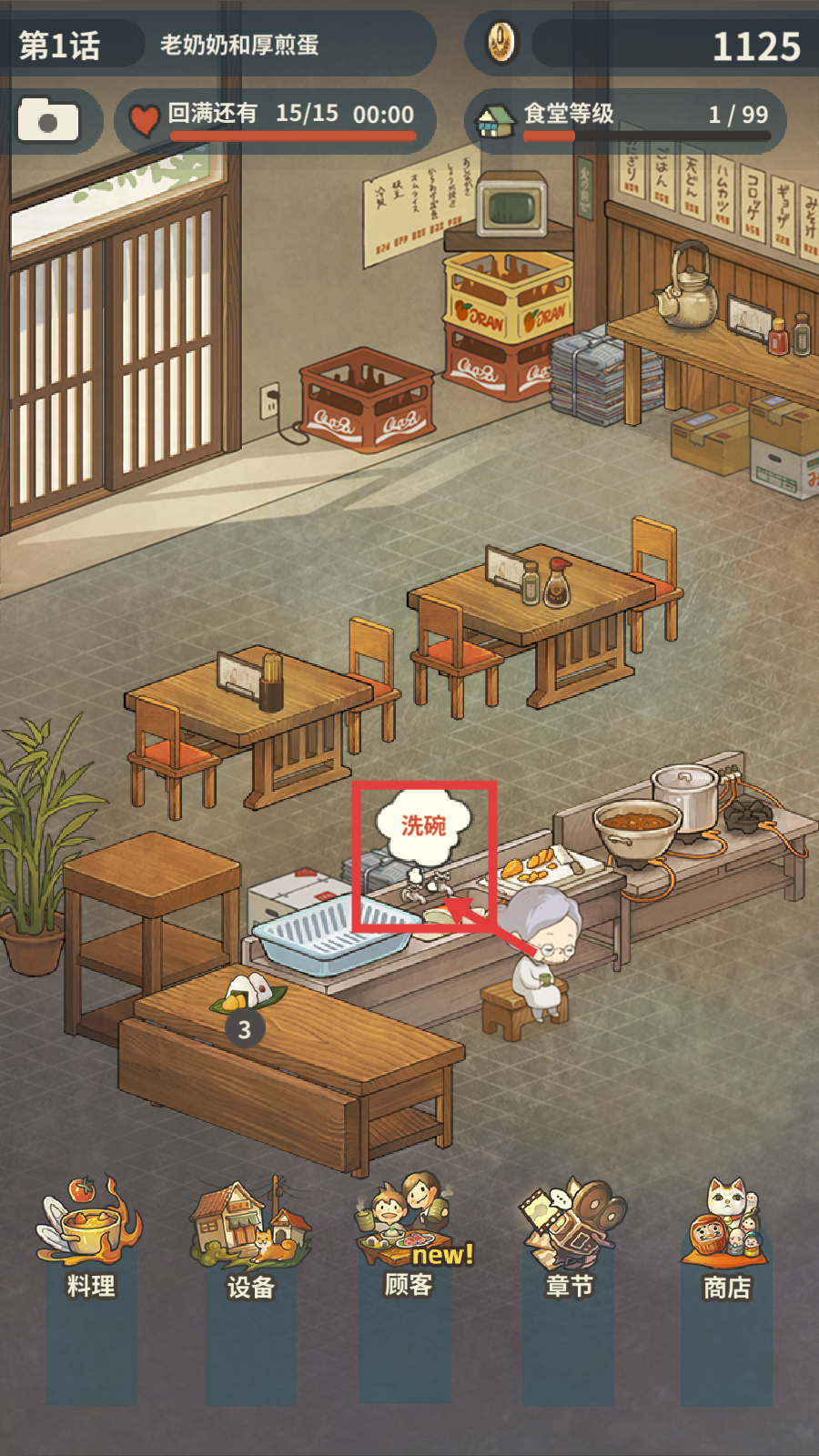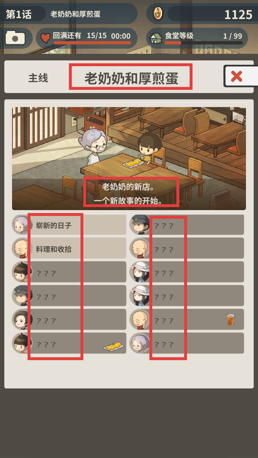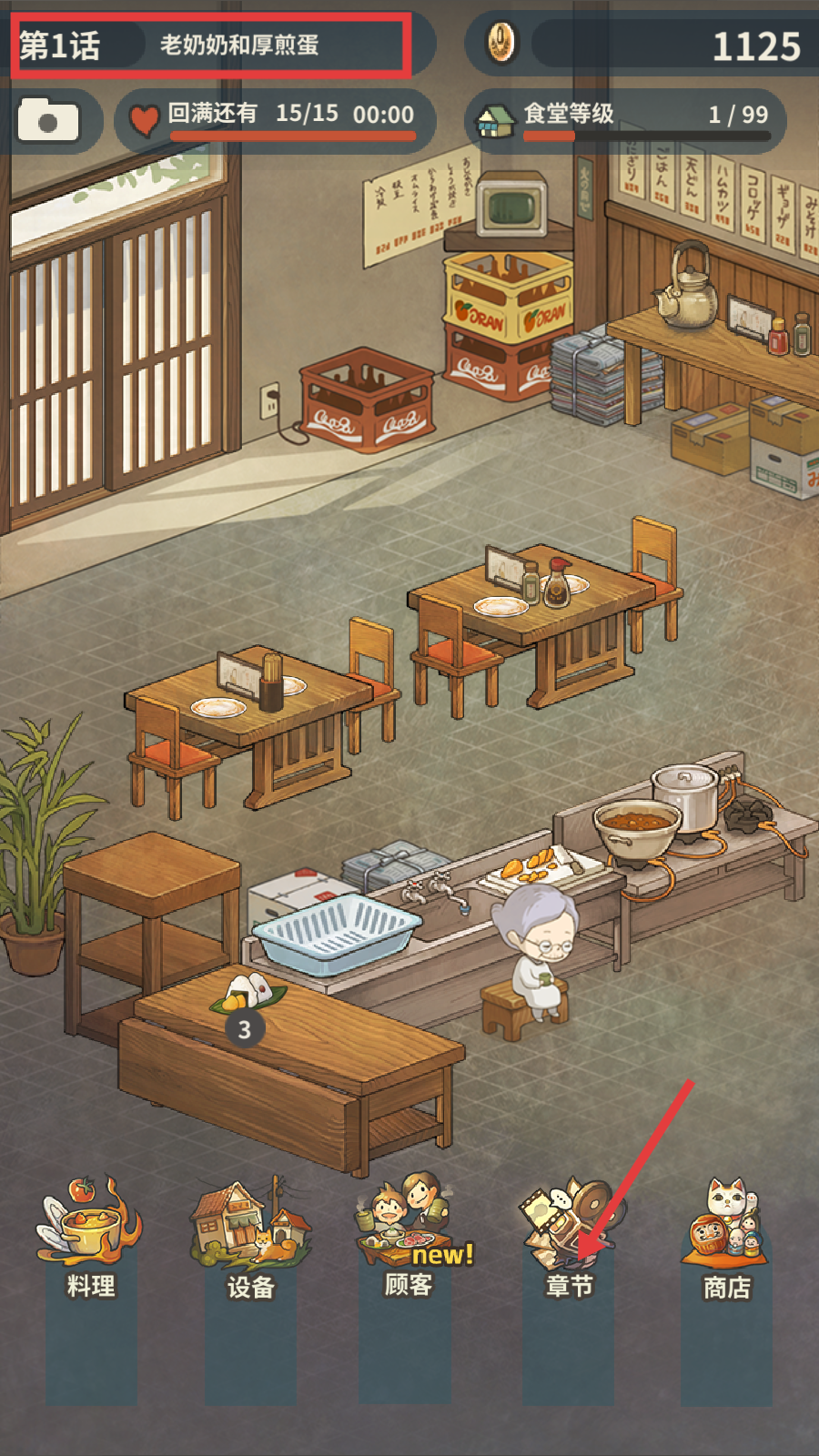 1、点击【章节】按钮,进入第1话【老奶奶和厚煎蛋】的主线剧情,正式开启食堂经营故事。