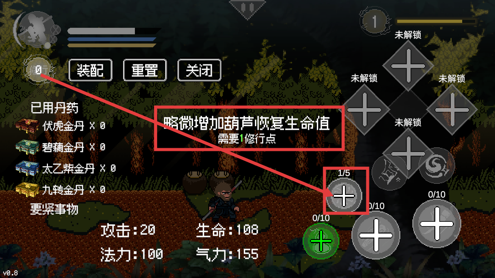 2、进入修行界面,花费修行点升级【略微增加葫芦恢复生命值】,提升自身生存能力。