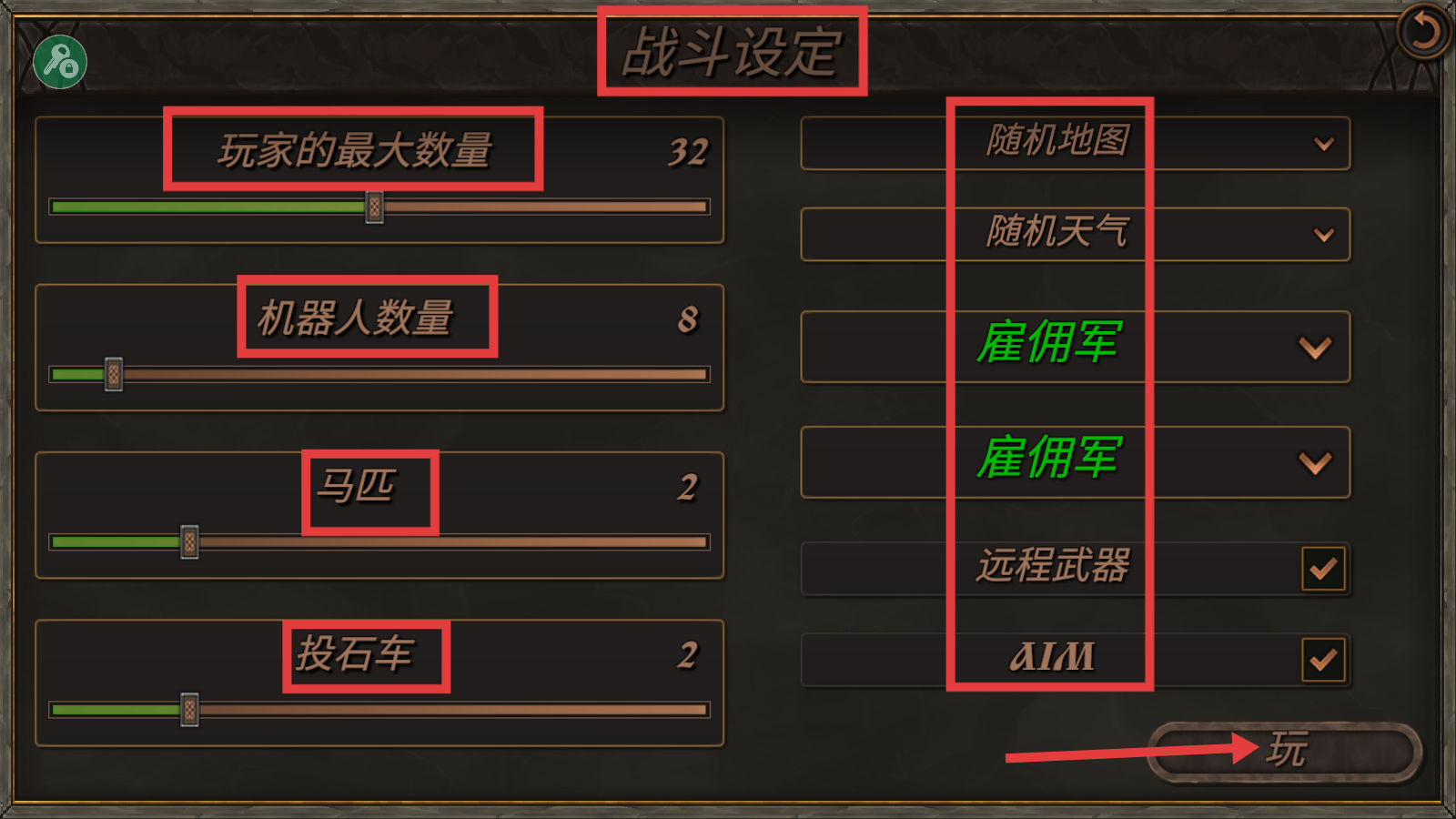 2、在战斗设定界面,调整【玩家的最大数量】【机器人数量】【马匹】【投石车】等参数,配置完成后点击【玩】。