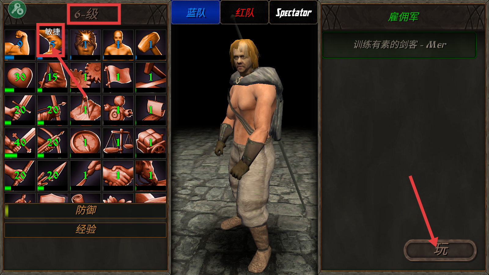 3、查看角色属性(6级,敏捷5等),选择雇佣兵阵营,点击【玩】进入战斗。