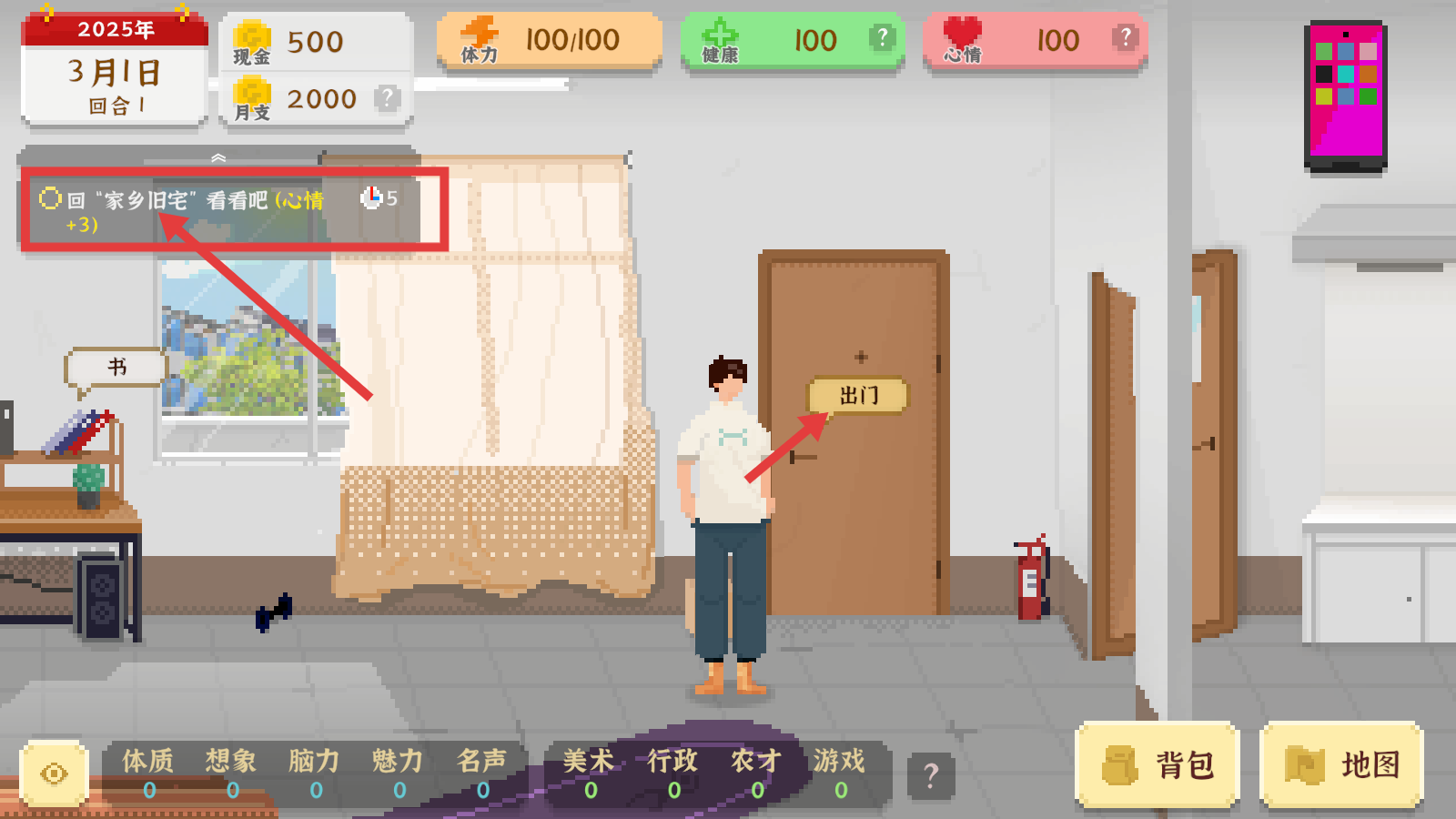1、接到【回“家乡旧宅”看看吧(心情+3)】任务后,点击【出门】,开启任务旅程。