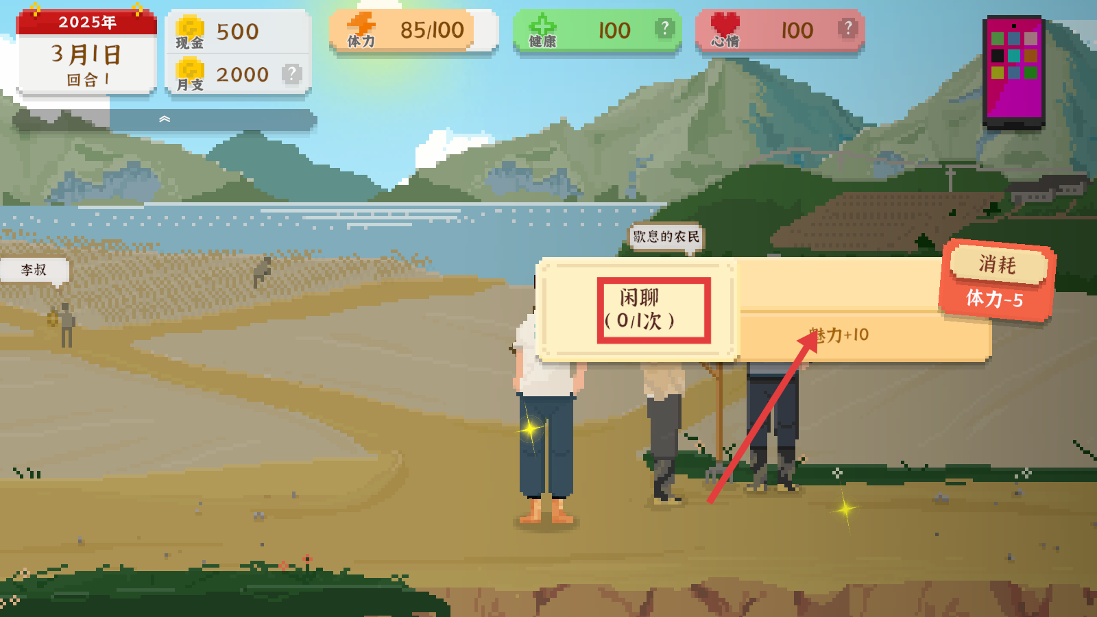 4、与歇息的农民进行【闲聊(0/1次)】,消耗体力-5,同时可获得魅力+10的增益。