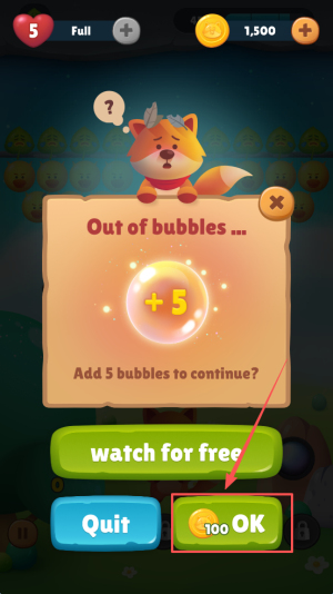 4、若提示“Out of bubbles...”点击“watch for free”领5球继续,或选“Quit”结束本局。