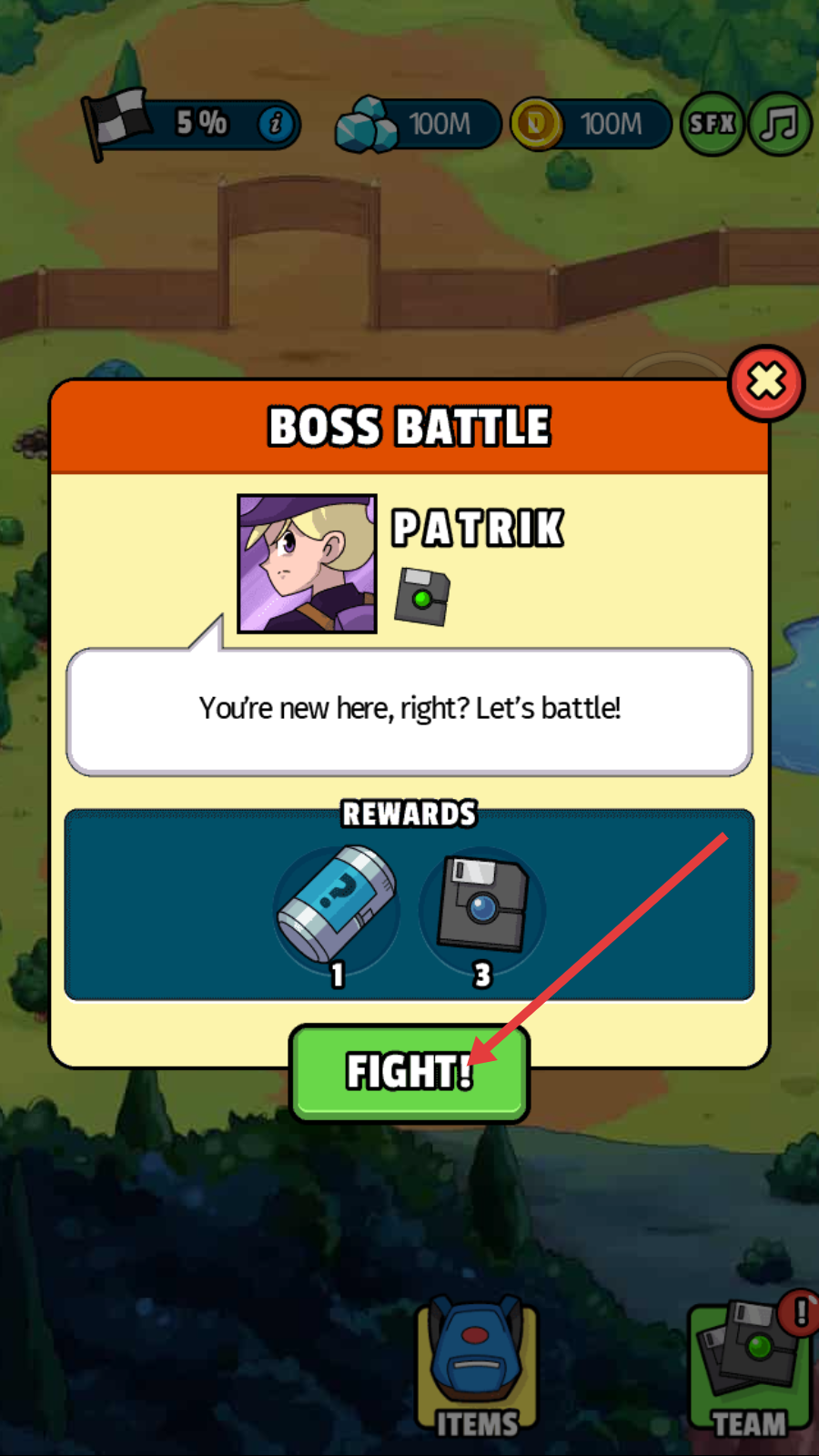 1、遇到【BOSS-BATTLE】的【PATRIK】时,点击【FIGHT!】参与战斗,可获得【神秘罐子-1】和【软盘-3】奖励,推进游戏进度。