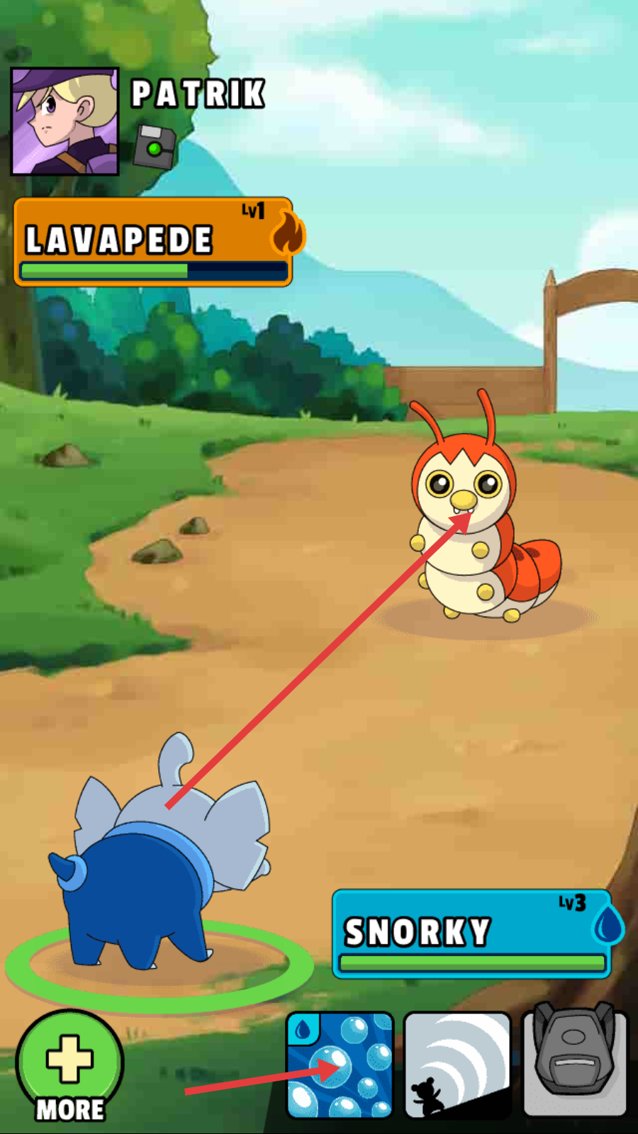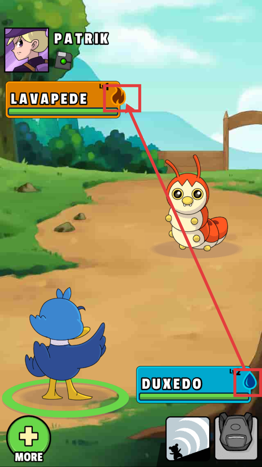2、战斗中注意对手【LAVAPEDE-火焰属性】与己方【DUXEDO-水属性】的克制关系,利用属性优势提升伤害。