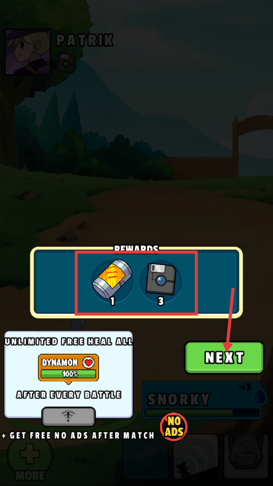 4、战斗结束后领取【火焰罐子-1】和【软盘-3】奖励,点击【NEXT】继续游戏,积累资源强化队伍。