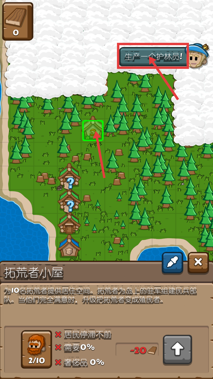 4、生产护林员,同时关注拓荒者小屋,它为10名拓荒者提供居住空间,助力居民发展和民兵部队组建。