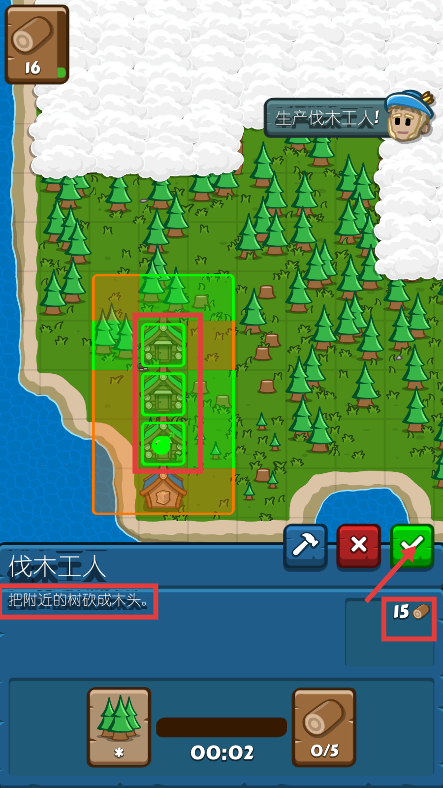 3、放置伐木工人建筑时,确认消耗木头,点击绿色对勾完成建造,让伐木工人生产木头资源。
