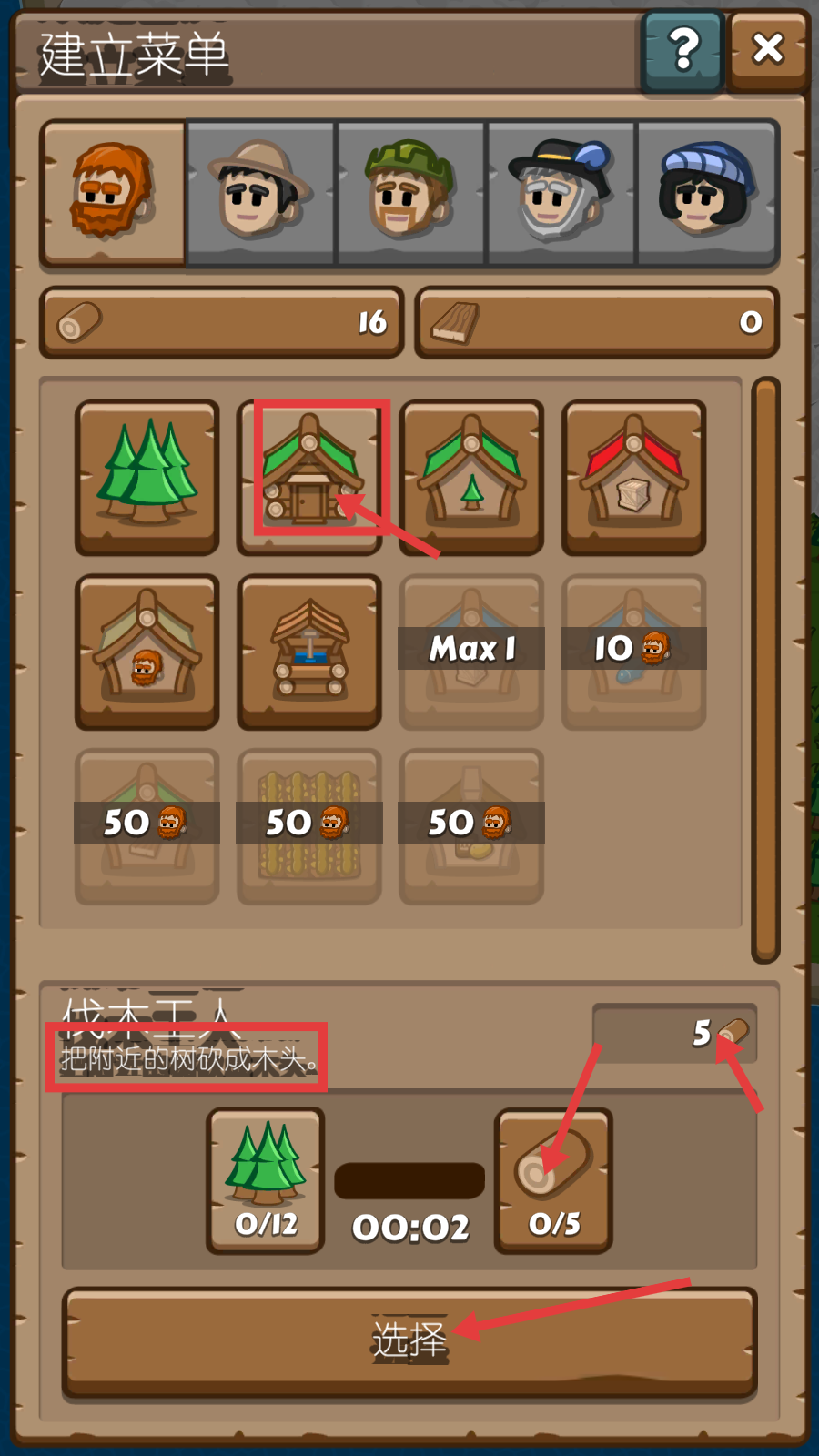 2、在【建立菜单】中选择伐木工人小屋,消耗木头资源,其功能是【把附近的树砍成木头】,点击选择开始建造。
