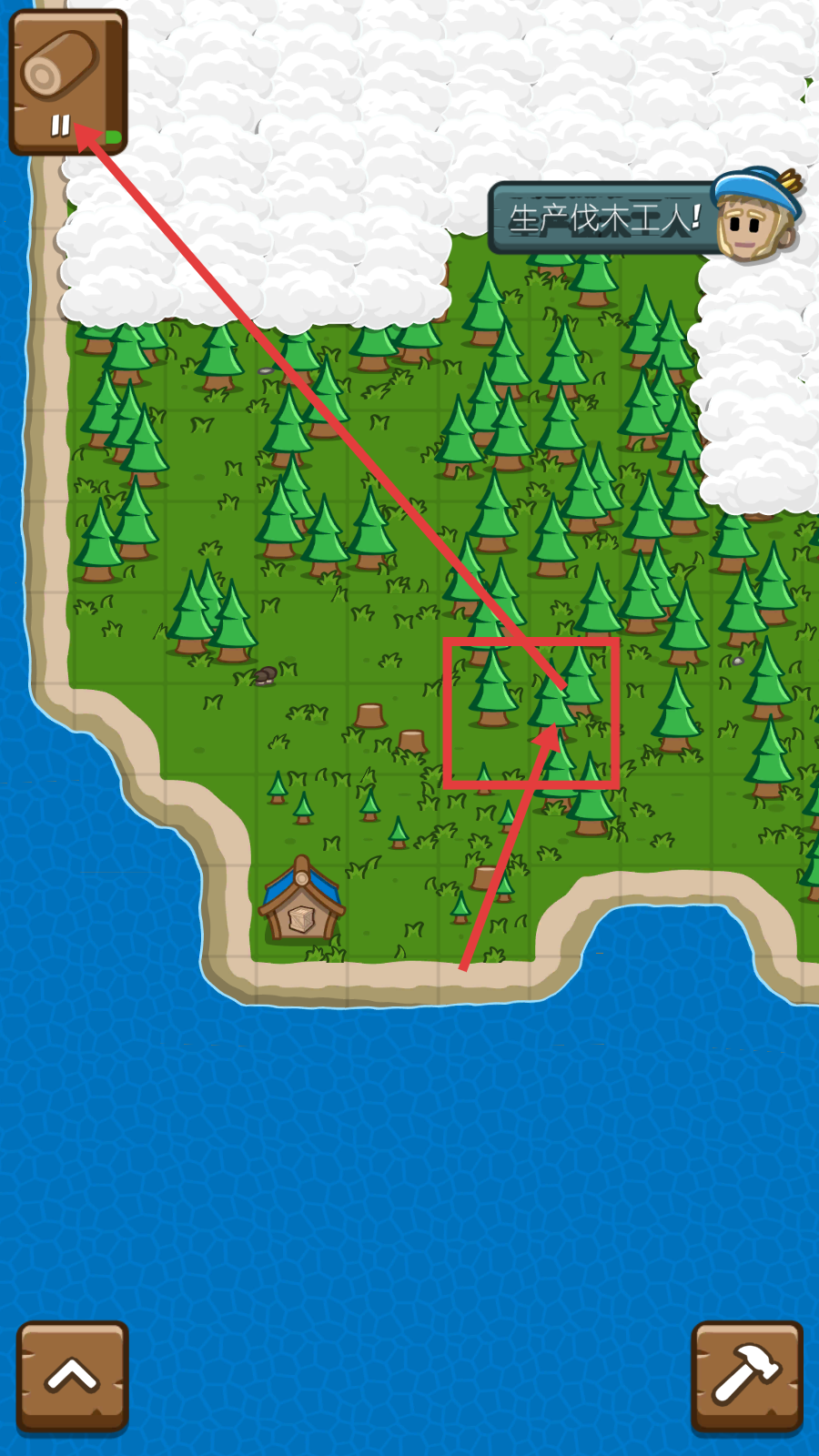 1、关注木头资源,根据提示生产伐木工人,砍伐树木获取木头,逐步积累资源推进游戏。