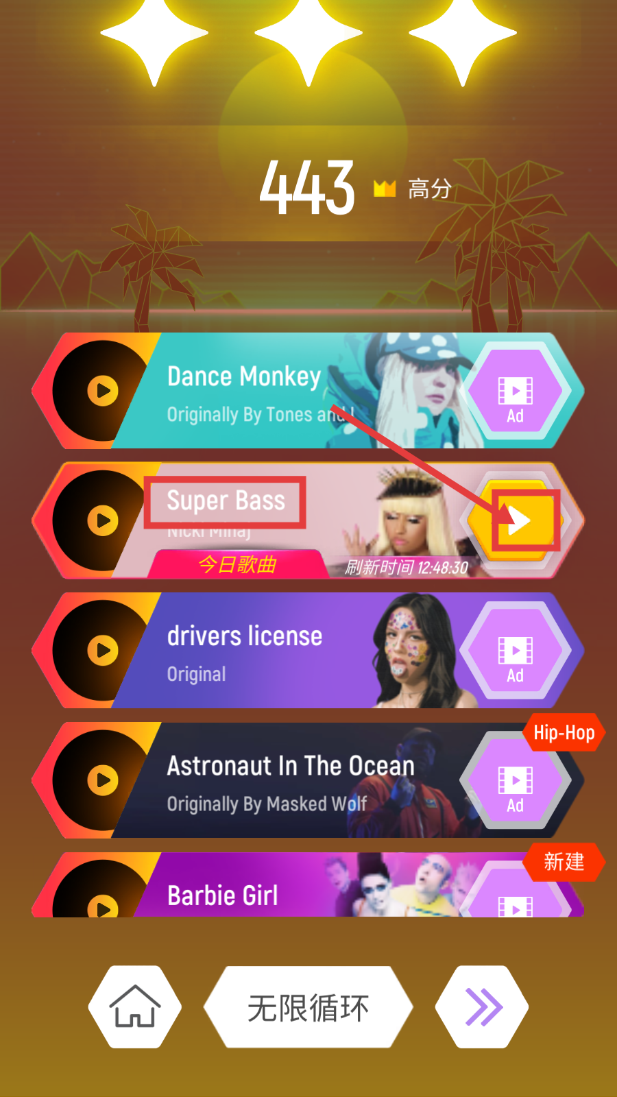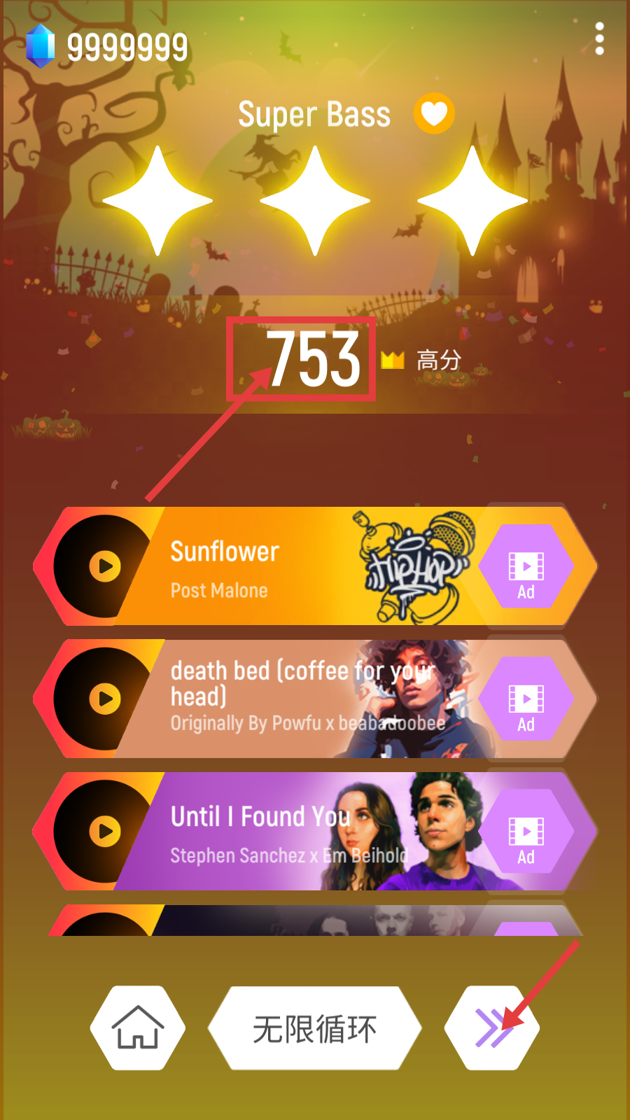 4、完成歌曲【SuperBass】后获得【753-高分】,点击箭头按钮继续选择下一首歌曲,挑战更多音乐关卡。