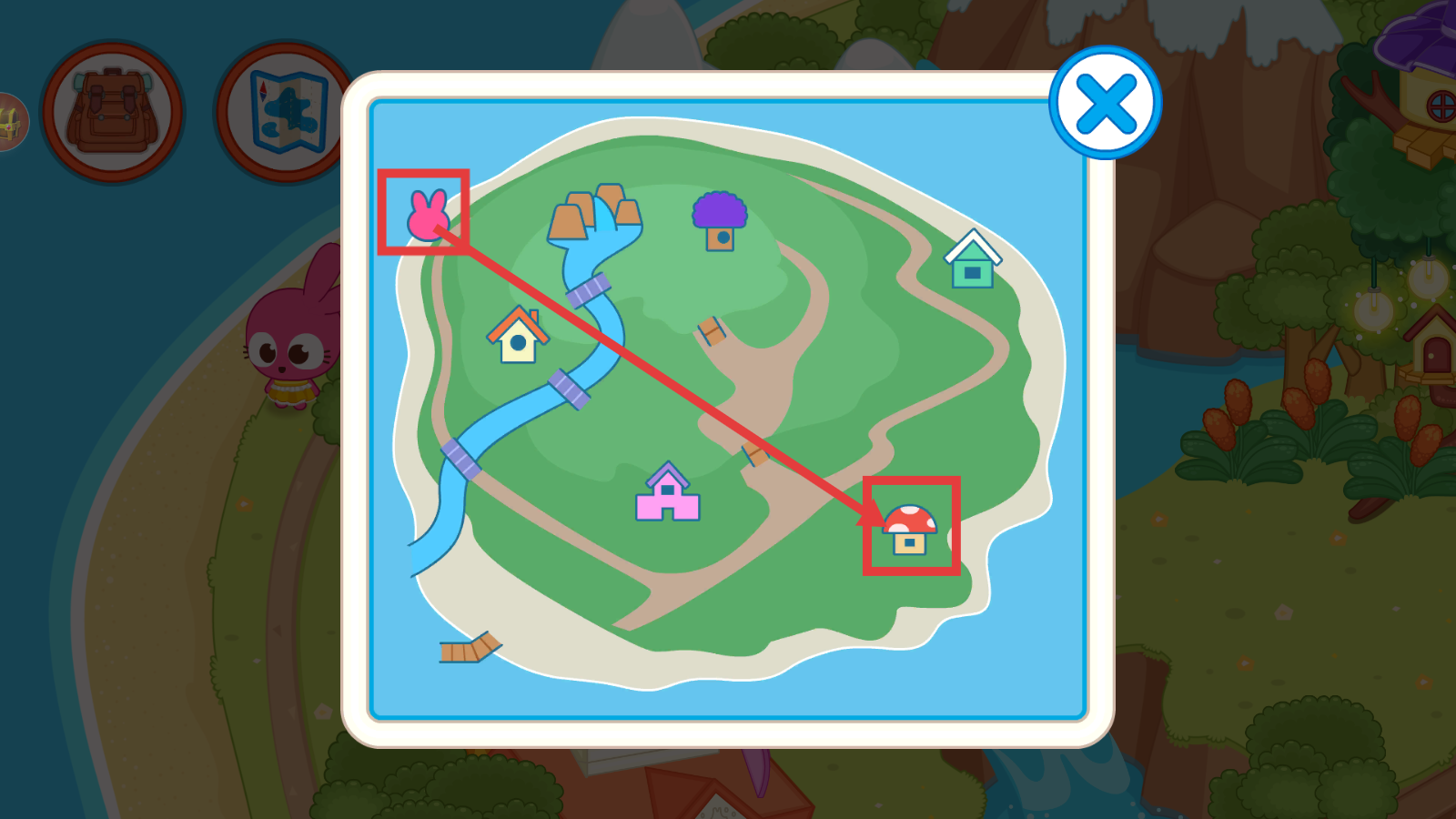 3、在地图界面,找到粉色兔子位置到蘑菇屋的路径,沿着路线前往目标地点。
