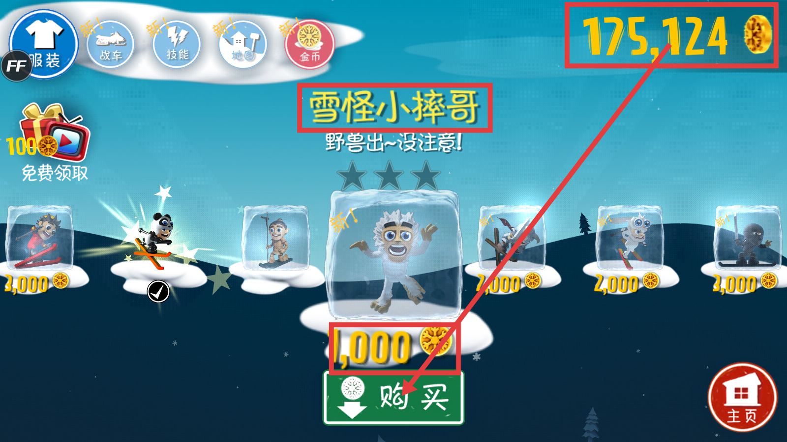 1、消耗1000金币购买“雪怪小摔哥”角色,当前金币存量充足(175,124),可提升游戏体验。
