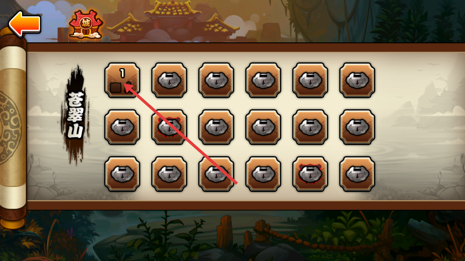 1、选择“苍翠山”第1关,开启冒险之旅。
