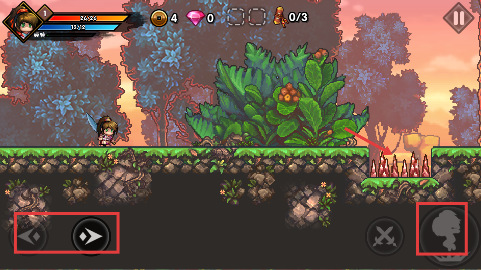 2、通过左侧方向键控制角色移动,右侧技能键(如冲刺)可躲避尖刺等障碍物。