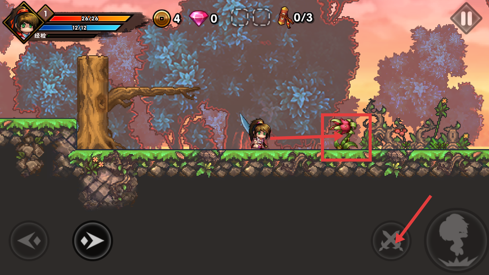 3、遇到怪物(如食人花)时,点击攻击键发起攻击,击败怪物可积累经验和金币。