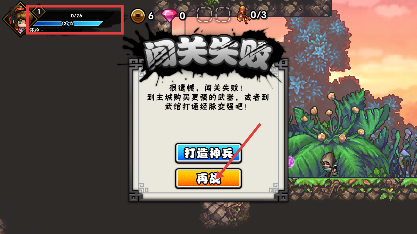 4、若闯关失败,可点击“再战”按钮重新挑战;也可选择“打造神兵”提升战力后再尝试冒险。