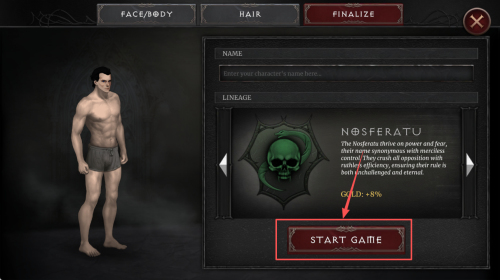 4、如何创建角色:在角色创建界面,自定义外观与血统,点击“START GAME”完成创建。