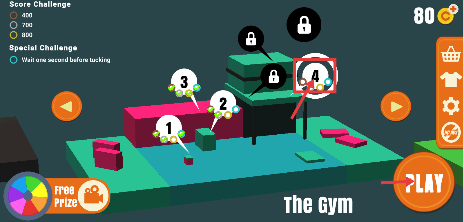1、进入“TheGym”场景,选择第4关,点击“PLAY”开启关卡挑战,逐步解锁更高难度关卡。