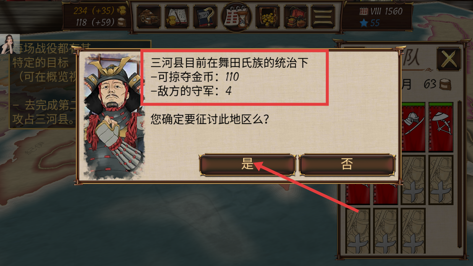 1、针对三河县(舞田氏族统治,可掠夺金币110,敌军守军4),点击“是”,确定征讨该地区,开启战役。