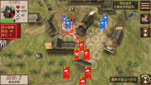 3、在回合2,选择要攻击的敌军单位发起攻击,查看战斗结果(如攻击40、阵亡3),逐步消灭敌军。