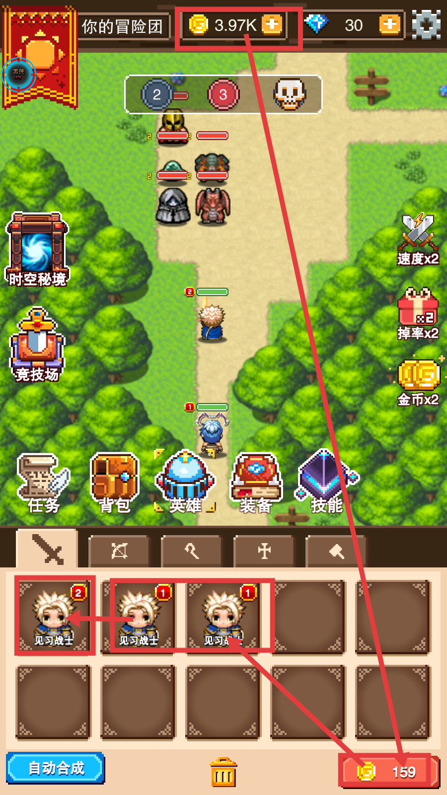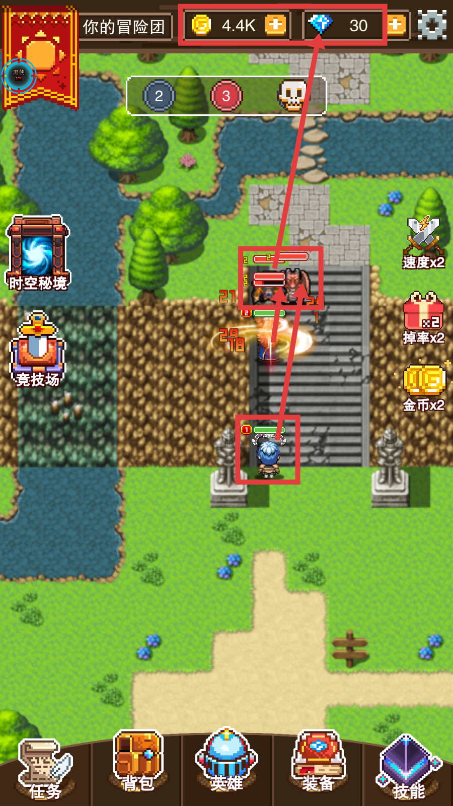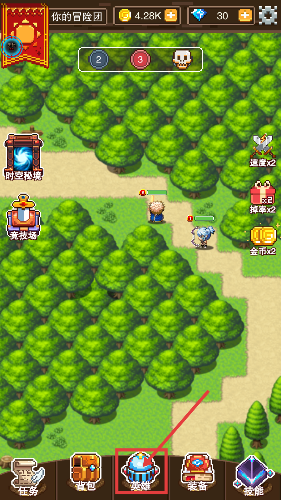 1、点击【英雄】按钮管理英雄,利用右侧【速度x2】【掉率x2】【金币x2】buff,提升冒险效率。